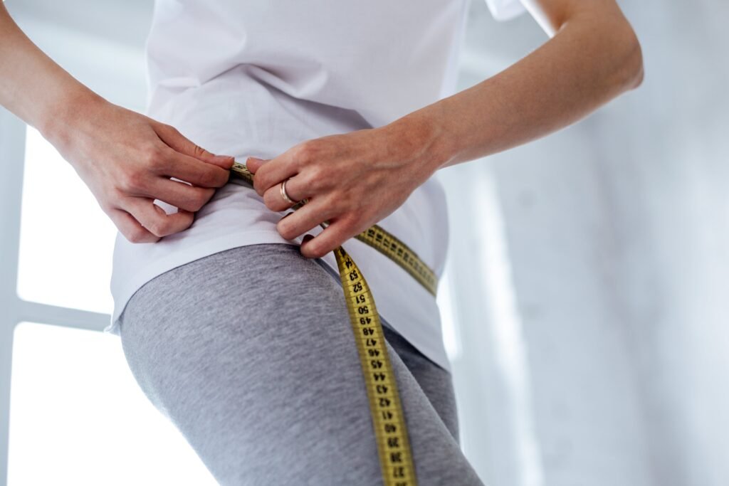 - Place the tape measure from the back around your hips, making sure the tape falls on the mid-section of your buttock